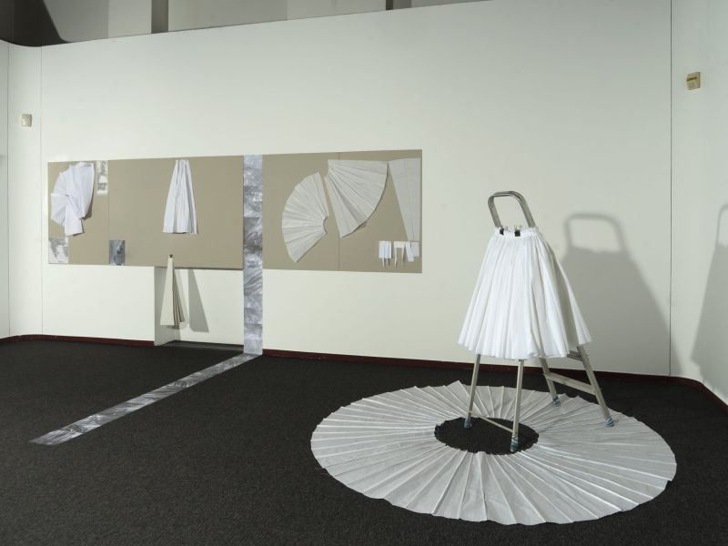 This «immaculate» ideologically charged dress, dominant in our national fantasy, with its strictly prescribed construction, comes to be represented by the artistic installation, as a meteoric u-topia in space and time detached from the human body. As a metamorphosed presence-absence that carves out new traces and leaves a different imprint on the ground.