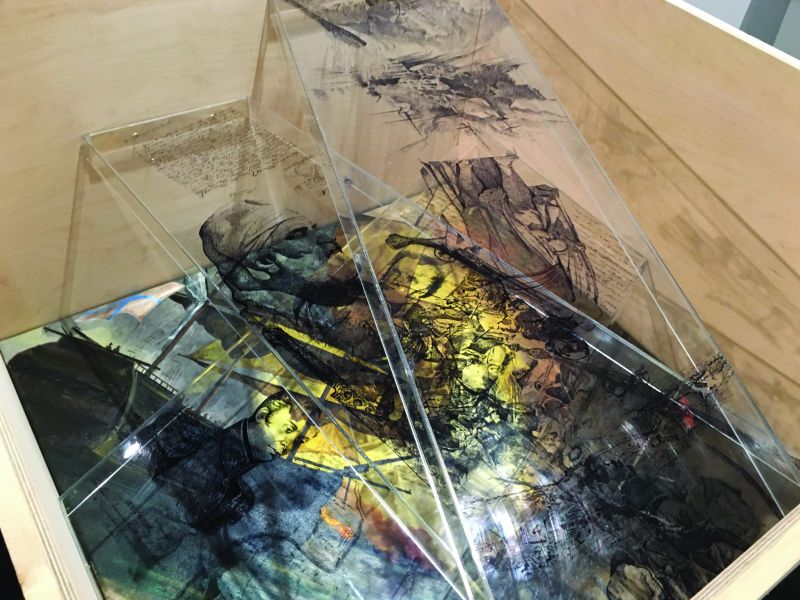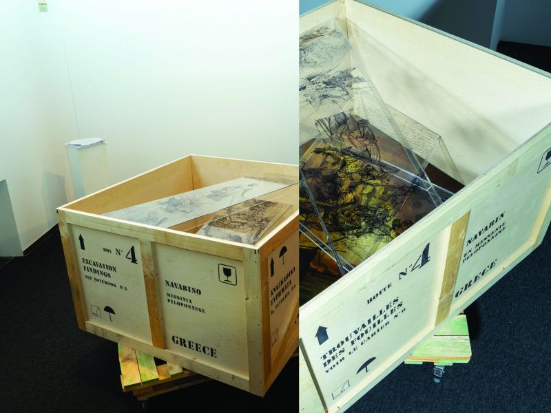 The artwork is a box that contains excavation findings from the Prefecture of Messinia Peloponnese with a focus on the area of Pylaia or Navarino. This box contains as “historical excavation findings” three events of the area during the revolution of 1821 expressed as different transparent levels on which these events are developed by design, which are visually intertwined. Starting from the top of the box and following the events chronologically, the first transparent level refers to the burning of the Turkish-Egyptian fleet in the port of Methoni in April 1825 by Miaoulis and Pipinos. The second level refers to the famous battle at Maniaki in May of the same year with the heroic sacrifice of the Greeks as another three hundred and led by Papaflessa with the famous embrace by Ibrahim to the dead hero and the third level depicts the three admirals who took part in naval battle of Navarino on 8/20. 10. 1827 together with an agenda of Cordrington’s naval battle in italian and a plan of that time as a plan of the naval battle. At the base of the box is placed a painting created especially for this purpose, depicting a scene from the naval battle of Navarino. On the 4 outer sides of the box, the same text is written in Greek, English, French, Russian, recalling the alliance of the great powers at that time that contributed decisively to the struggle of the Greeks for liberation from the Ottoman yoke.